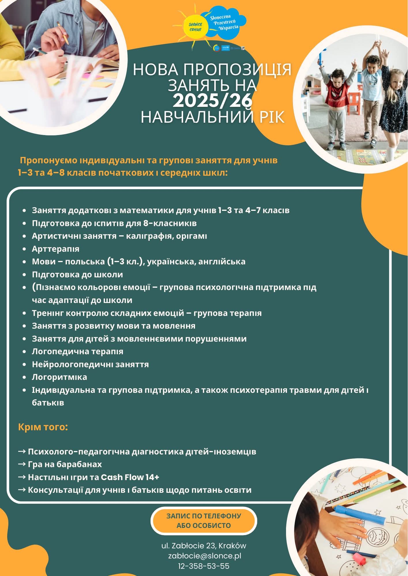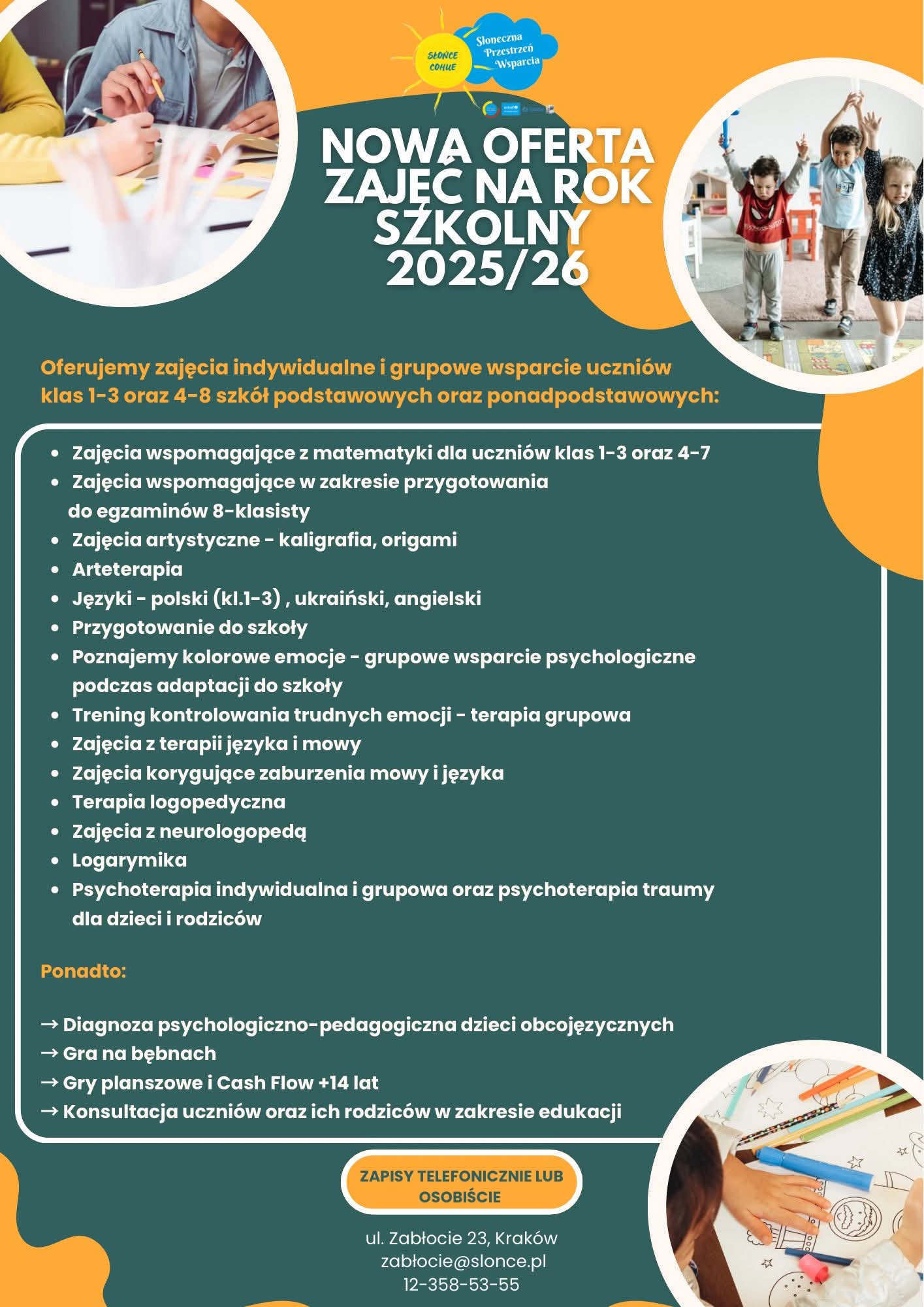 Serdecznie zapraszamy do zapisów na zajęcia, które prowadzi nasza Słoneczna Przestrzeń Wsparcia "Słońce" na Zabłociu 23, w roku szkolnym 2025/2026.
