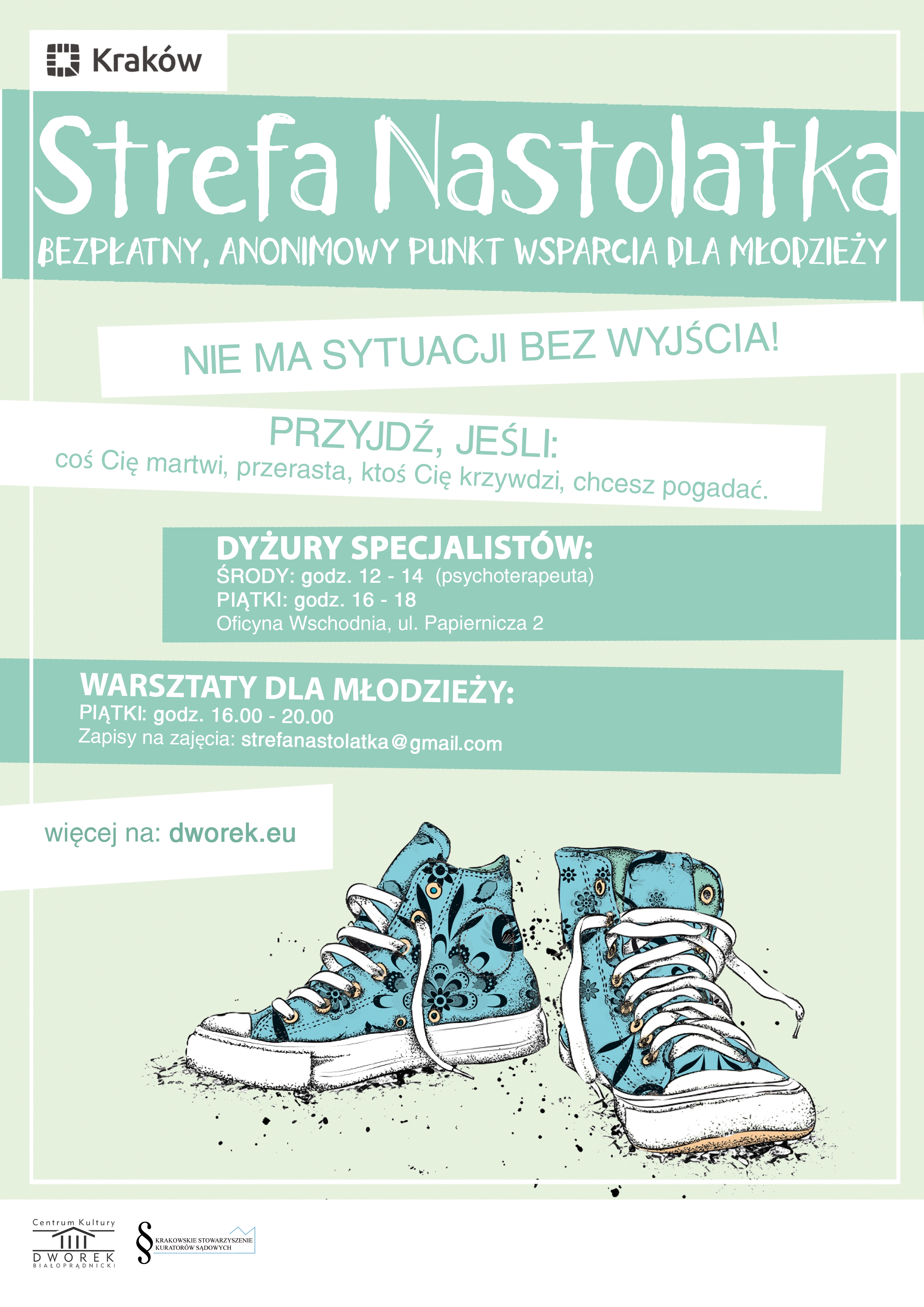 Jeśli masz „naście lat”, coś Cię gnębi, przerasta, ktoś Cię krzywdzi lub masz inny problem w domu czy w szkole, z którym nie potrafisz sobie poradzić - przyjdź do Strefy Nastolatka w Dworku Białoprądnickim. To przyjazne miejsce, w którym możesz anonimowo i bezpłatnie uzyskać życzliwą i fachową pomoc w trudnych sytuacjach. Jesteś rodzicem i nie wiesz "jak ugryźć" problem? Też będziesz mile widziany! Strefa otwarta jest w środy i w piątki.