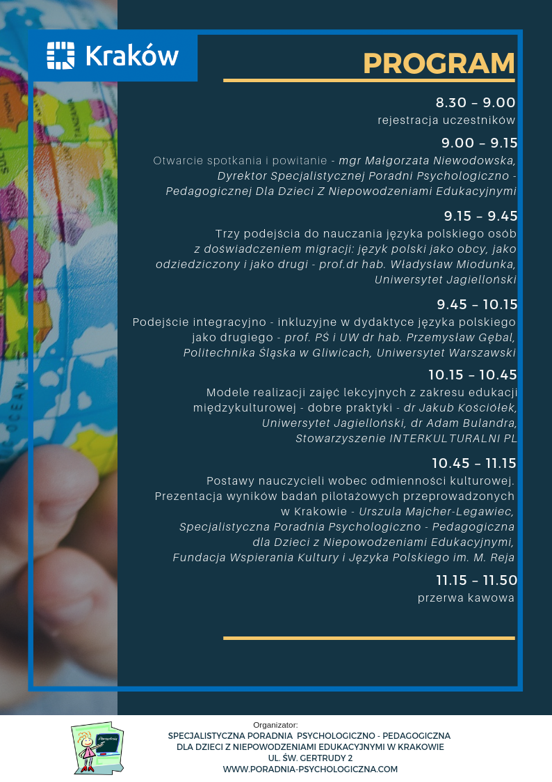 W drugiej części konferencji, po przerwie, omówione zostaną takie zagadnienia, jak wspomaganie nauczycieli i szkół jako zadanie Poradni Psychologiczno-Pedagogicznej dla Dzieci z Niepowodzeniami Edukacyjnymi, rola i zadania asystenta kulturowego oraz działalność Punktu Informacyjnego dla Obcokrajowców. Szczegóły znajdą Państwo w programie wydarzenia. Konferencja zaplanowana jest w godzinach od 9.00 (rejestracja od 8.30) do 13.15.