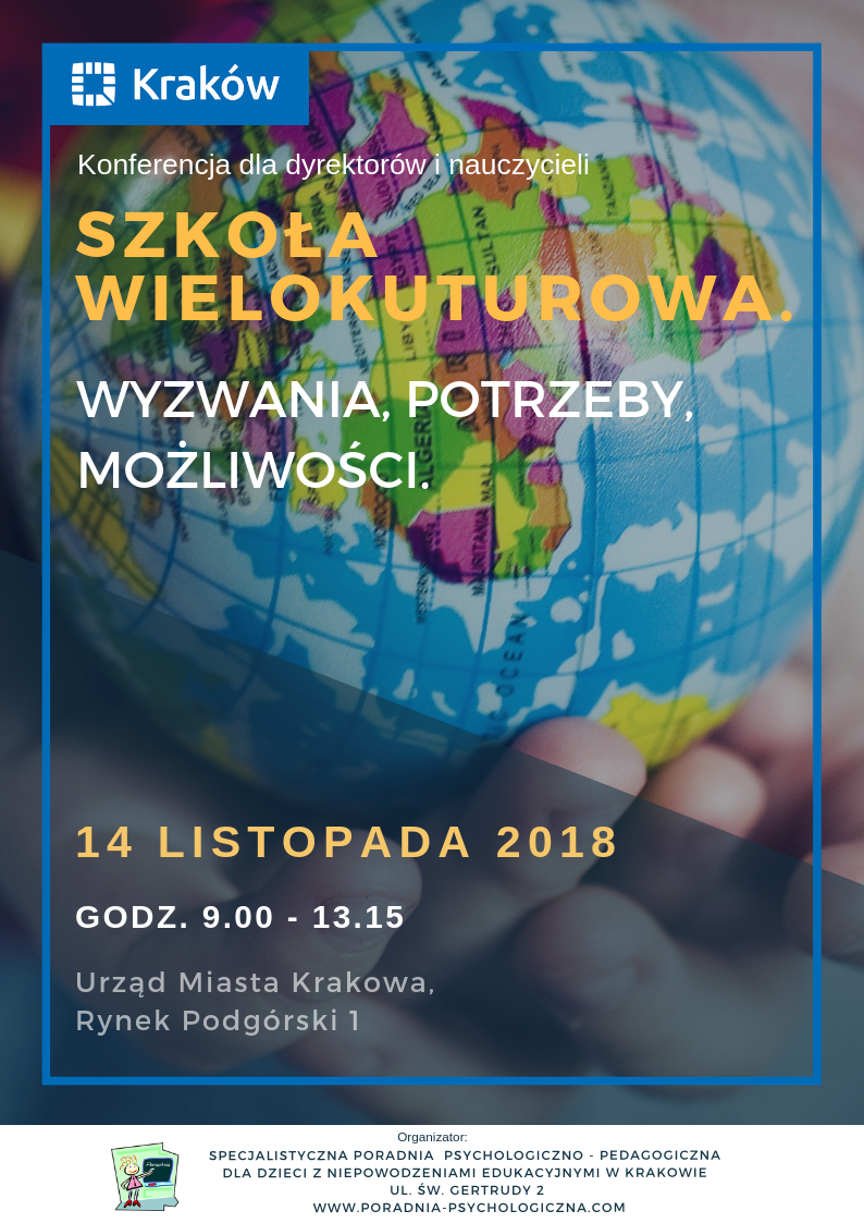 Dyrektor Specjalistycznej Poradni Psychologiczno-Pedagogicznej dla Dzieci z Niepowodzeniami Edukacyjnymi Małgorzata Niewodowska oraz Doradca metodyczny ds. wielokulturowości Urszula Majcher-Legawiec zapraszają na konferencję "Szkoła wielokulturowa - wyzwania, potrzeby, możliwości", która odbędzie się 14 listopada w Urzędzie Miasta Krakowa, Rynek Podgórski 1.