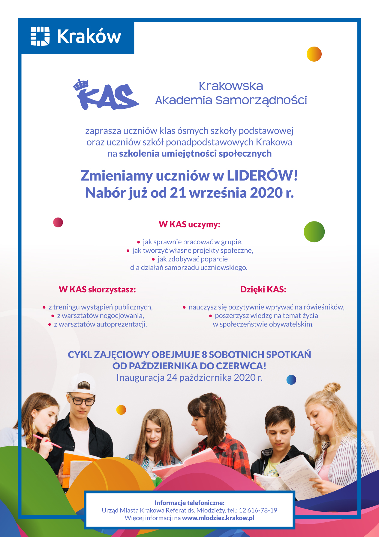 Zapraszamy do udziału w 16. edycji Krakowskiej Akademii Samorządności. KAS jest szkołą liderów młodzieżowych, dzięki której uczniowie zdobywają umiejętności społeczne oraz wiedzę wykorzystywaną do pracy w grupie, w samorządzie uczniowskim i w procesie budowania przywództwa.