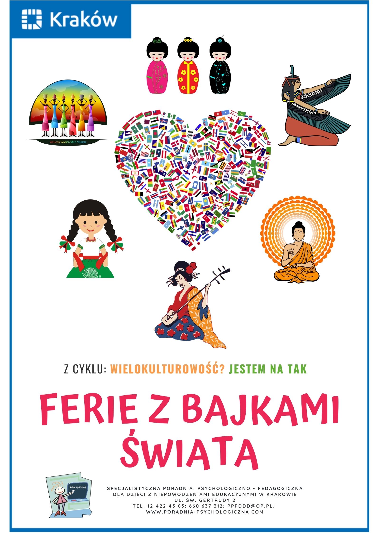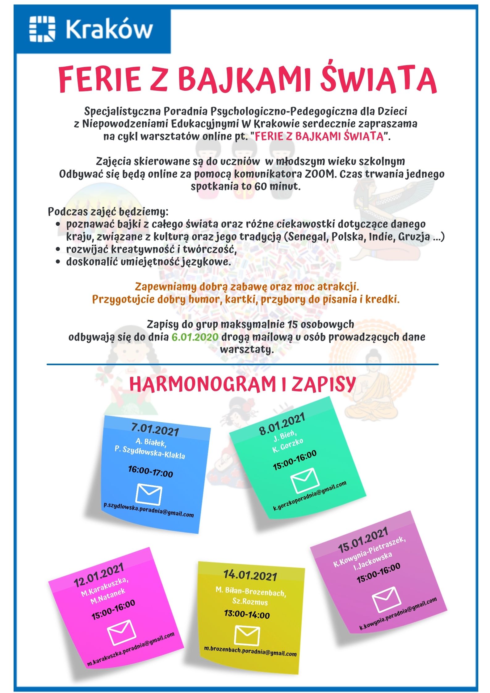 - Cykl warsztatów online pt. ''Ferie z bajkami świata'' przygotowany przez Specjalistyczną Poradnię Psychologiczno-Pedagogiczną dla Dzieci z Niepowodzeniami Edukacyjnymi w Krakowie - plakat oraz harmonogram/zapisy.