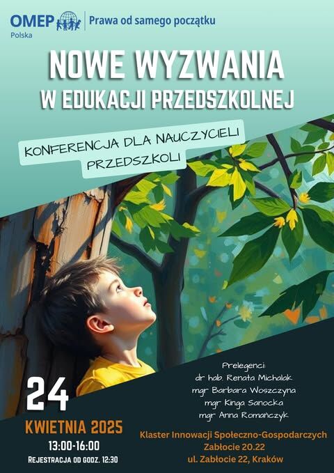 Krakowski Oddział Światowej Organizacji Wychowania Przedszkolnego OMEP zaprasza nauczycieli wychowania przedszkolnego, dyrektorów placówek edukacyjnych oraz wszystkich, którym bliska jest edukacja najmłodszych, do udziału w konferencji, która odbędzie się 24 kwietnia 2025 roku w Klastrze Innowacji Społeczno-Gospodarczych Zabłocie 20 przy ul. Zabłocie 22 w Krakowie.