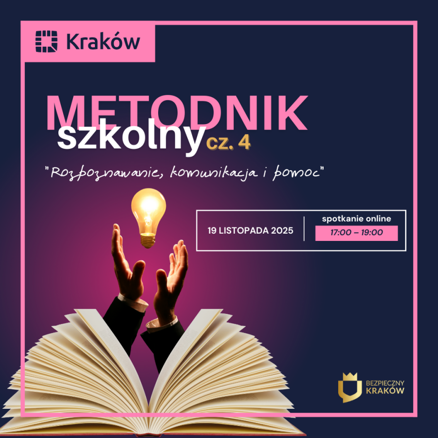 Wydział Bezpieczeństwa i Zarządzania Kryzysowego UMK serdecznie zaprasza na czwarty bezpłatny webinar przeznaczony dla dyrektorów, nauczycieli oraz wychowawców krakowskich szkół dot. wsparcia psychicznego i rozwojowego w codziennym funkcjonowaniu zawodowym pn. „METODNIKszkolny”, realizowany na potrzeby Programu poprawy bezpieczeństwa dla miasta Krakowa na lata 2025-2028 pn. „Bezpieczny Kraków”.