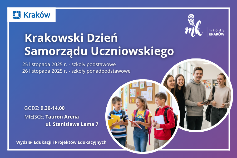 Wydział Edukacji i Projektów Edukacyjnych serdecznie zaprasza samorządy uczniowskie szkół podstawowych oraz szkół ponadpodstawowych wraz z opiekunami samorządów do udziału w wydarzeniu Krakowski Dzień Samorządu Uczniowskiego. Wydarzenie odbędzie się 25 listopada dla szkół podstawowych oraz 26 listopada dla szkół ponadpodstawowych w godz. 9:30-14:00 w Sali Konferencyjnej Zachodniej, w TAURON Arenie Kraków, ul. Stanisława Lema 7.
