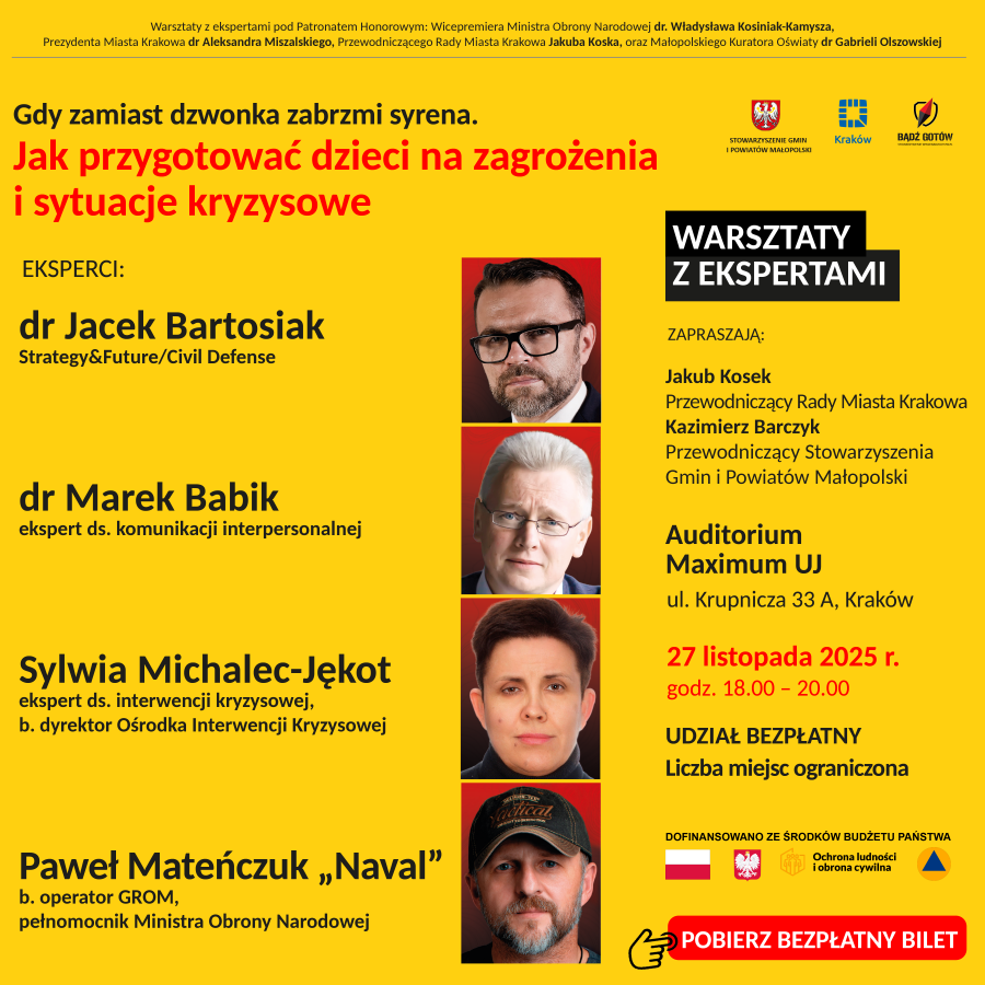 W imieniu Samorządu Miasta Krakowa, Stowarzyszenia Gmin i Powiatów Małopolski oraz Stowarzyszenia „Bądź gotów!” zapraszamy Państwa na warsztaty z ekspertami pt. „Gdy zamiast dzwonka zabrzmi syrena. Jak przygotować dzieci na zagrożenia i sytuacje kryzysowe”, które odbędą się 27 listopada br. o godz. 18.00 w Auditorium Maximum UJ przy ulicy Krupniczej 33 w Krakowie.