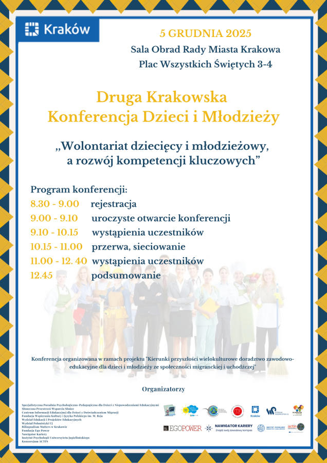 serdecznie zapraszamy wszystkich zainteresowanych, a szczególnie dzieci i młodzież, do udziału w „Drugiej Krakowskiej Konferencji Dzieci i Młodzieży” „Wolontariat dziecięcy i młodzieżowy, a rozwój kompetencji kluczowych”, która odbędzie się 5 grudnia br. w godz.8.30-12.30 w Sali Obrad Miasta Krakowa na pl. Wszystkich Świętych.