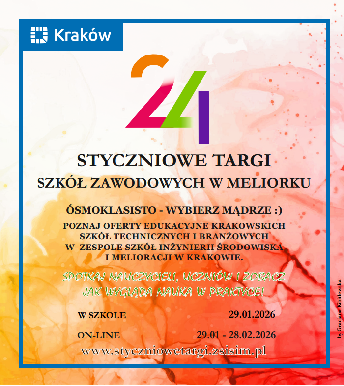 W dniu 29 stycznia 2026 r. na terenie Zespołu Szkół Inżynierii Środowiska i Melioracji w Krakowie przy ul. Ułanów 9, a także od 29 stycznia 2026 r. do 28 lutego 2026 r., na stronie internetowej styczniowetargi.zsisim.pl odbędą się XXIV „Styczniowe Targi Szkół Zawodowych w Meliorku” – impreza o charakterze edukacyjno – wychowawczym, przygotowana w szczególności z myślą o uczniach klas ósmych szkół podstawowych, ich rodzicach oraz nauczycielach.