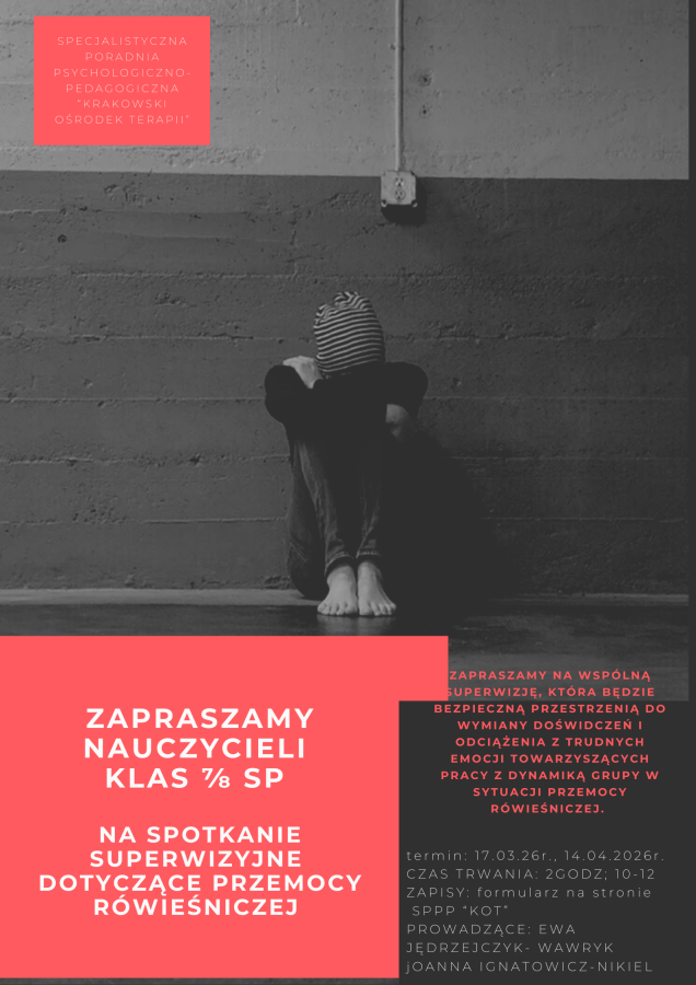 Specjalistyczna Poradnia Psychologiczno-Pedagogiczna pn. „Krakowski Ośrodek Terapii” zaprasza nauczycieli klas VII-VIII szkół podstawowych zatrudnionych w placówkach prowadzonych przez Gminę Miejską Kraków do udziału w dwóch spotkaniach superwizyjnych.