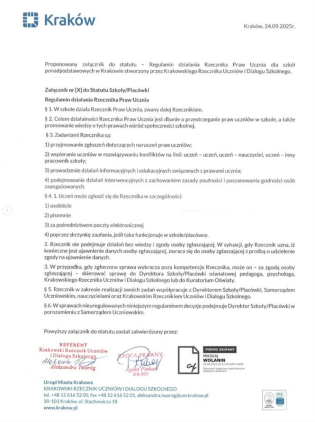 Jako Krakowski Rzecznik Uczniów i Dialogu Szkolnego przygotowałam propozycję wpisu do statutu szkoły o Szkolnym Rzeczniku Praw Ucznia, a także załącznik - regulamin jego działalności.