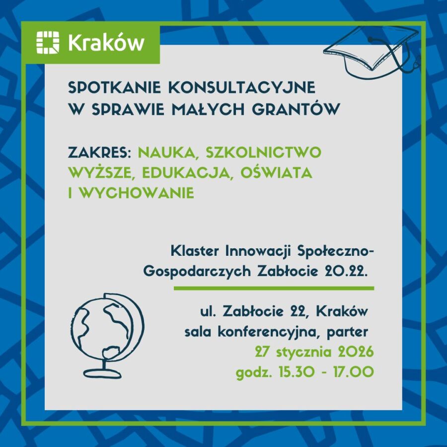 Serdecznie zapraszamy organizacje pozarządowe działające w obszarze edukacji do udziału w spotkaniu konsultacyjnym dotyczącym uproszczonych wniosków o realizację zadań publicznych w ramach art.19a, czyli tzw. małych grantów. Spotkanie odbędzie się 27 stycznia 2026 roku o godz. 15.30 w Klastrze Innowacji Społeczno-Gospodarczych Zabłocie przy ul. Zabłocie 22 w sali konferencyjnej na parterze.