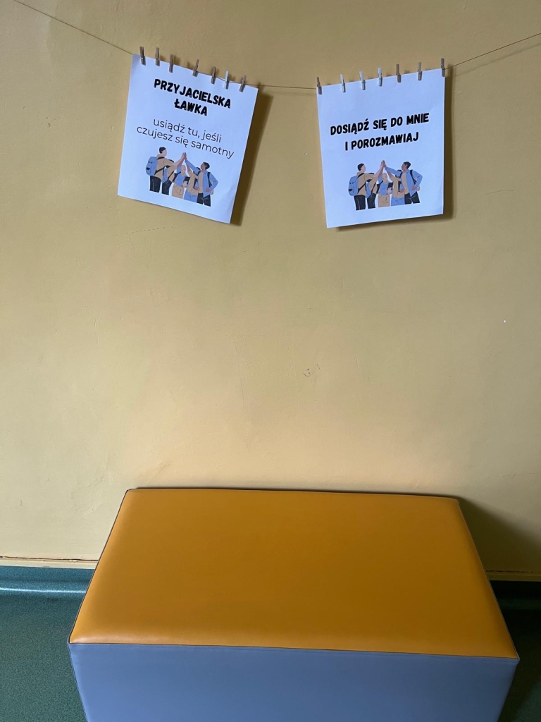 - W szkole wprowadzono inicjatywę „przyjacielskiej ławki”, czyli specjalnej ławki w korytarzu, gdzie można usiąść, gdy ktoś czuje się samotny – sygnał dla innych, by dołączyć i porozmawiać z tą osobą.