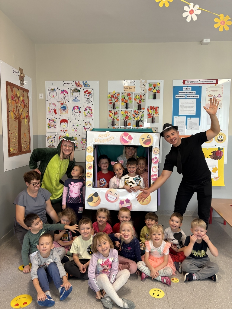 - 3.10.2025 w ramach promocji radości, dobroci i pozytywnego nastawienia do innych zorganizowano „Dzień Uśmiechu”. Już od rana dzieci i rodzice witani byli przez radosne Dinozaury (przebrani pracownicy) rozdające naklejki z „uśmieszkami”. Wszyscy mogli sobie zrobić „radosne zdjęcie” w fotobudce. W salach dzieci uczestniczyły w zabawach, które dały im moc radości, a z przedszkola wyszły z balonikiem,który samodzielnie ozdobiły „uśmieszkami”.