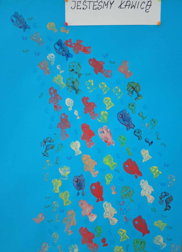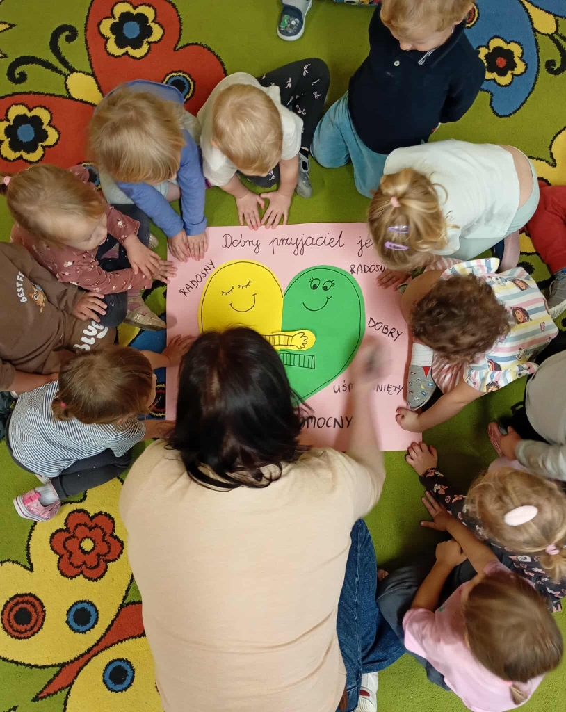 W ramach zajęć realizowane były scenariusze „Metafora serduszka” i „Ławica ryb”, które pomagały dzieciom wyobrazić sobie relacje jako wspólne bycie w jednej sieci zaufania i empatii. Dzieci tworzyły plakaty grupowe na tematy takie jak: „Nasza grupa”, „Drzewko dobrych słów”, „Drzewko przyjaźni”, „Galeria uśmiechów”, „Krąg dziecięcych rąk” oraz „Dobry przyjaciel jest...”. Te prace stały się nie tylko piękną dekoracją przedszkolnego korytarza, lecz także wizualnym przypomnieniem zasad życzliwości i współpracy obowiązujących w grupie.