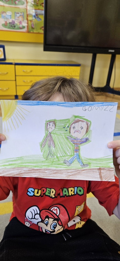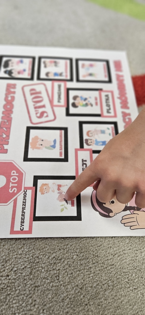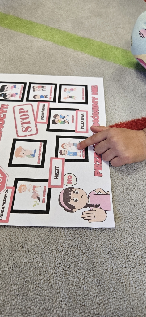 Dzieci bardzo dużo i chętnie opowiadały na ten temat. Obejrzały bajkę edukacyjną, odgrywały scenki rodzajowe. Szukały sposobów na radzenie sobie w sytuacjach, kiedy komuś dzieje się krzywda. Poznały znaczenie słowa HEJT (w cyberprzestrzeni, bezpośredni,psychiczny)