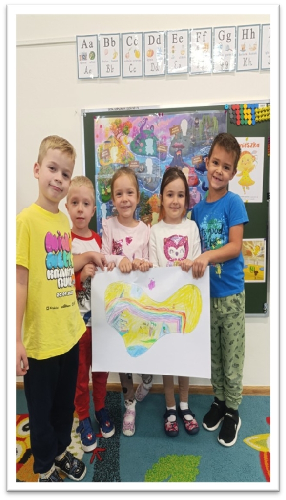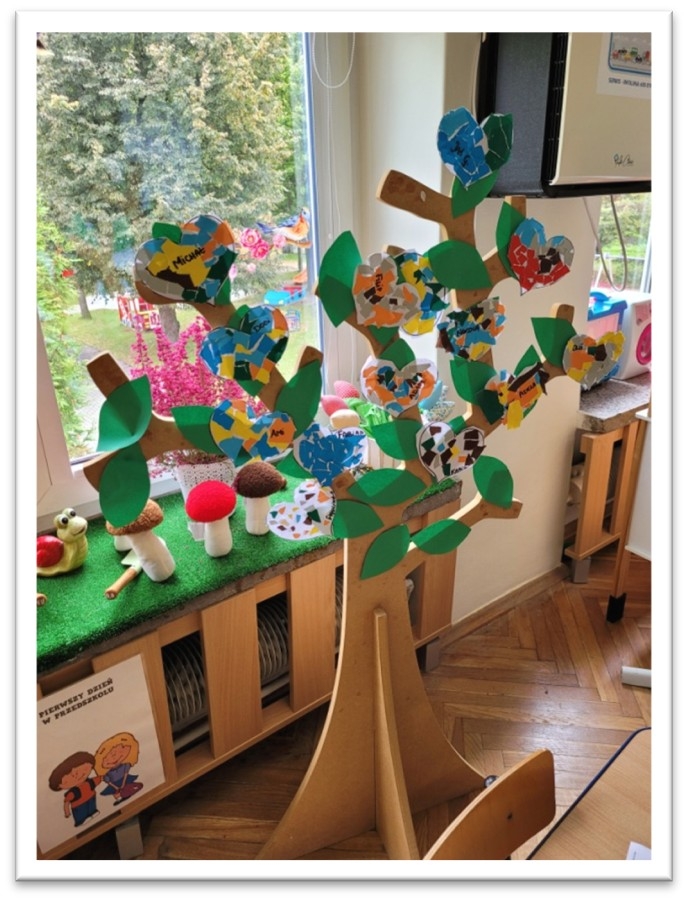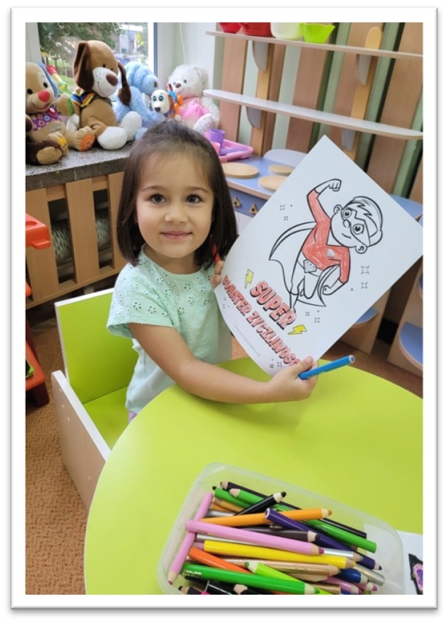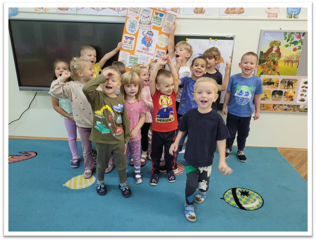 W ramach tygodnia budowania dobrych relacji rówieśniczych i przeciwdziałania przemocy rówieśniczej dzieci brały udział w zabawach integracyjnych: ,,Wędrująca piłeczka”, ,,Iskierka przyjaźni”, ,,Przywitajmy się wesoło”, ,,Bal przyjaźni”, „Ludzik z rąk” . Zabawy te miały na celu bliższe poznanie swoich kolegów i koleżanek z grupy. Dzieci słuchały bajek terapeutycznych: ,,Przyjaciel potrzebny od zaraz” oraz „Serduszko z listków”, dzięki którym potrafiły określić znaczenie przyjaźni. Mówiliśmy o swoich talentach i mocnych stronach, ale też o tym co w nas słabsze i sprawia nam smutek. Na znak grupowej przyjaźni udekorowaliśmy nasze drzewko serduszkami przyjaźni, wspólnie stworzyliśmy także plakat, aby pokazać innym, że każdy może być Superbohaterem Życzliwości.