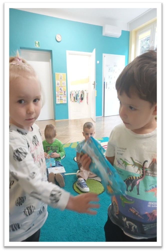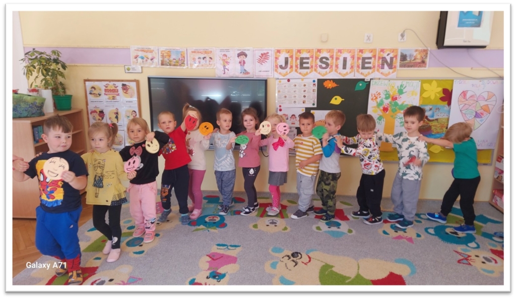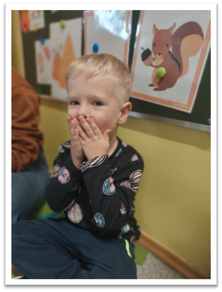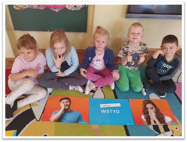 w krainie emocji”. Poznaliśmy postać Szakala i Żyrafy i już wiemy, że to my decydujemy jakie słowa będą padać z naszych ust w stosunku do innych. Wszyscy zgodnie stwierdziliśmy, że wolimy używać języka żyrafy a nie „gryźć” słowami jak szakal. Dzieci uczestniczyły w zabawie ruchowej ,,Podróż do Krainy Radości , Złości, Spokoju”, zapoznały się z różnymi emocjami na postawie krótkich zagadek oraz tablic demonstracyjnych. Prowadzone były codzienne rozmowy z dziećmi na temat emocji i tego, co w danym momencie czują. Wyjaśnianie i tłumaczenie dzieciom, że każda emocja jest ważna w naszym życiu oraz dlaczego ważne jest, aby szanować emocje innych osób. Prowadzone były gry i zabawy pozwalające na rozwijanie umiejętności rozpoznawania emocji np. „Kostka emocji”, „Zegar emocji”, „Emocje-memo”.