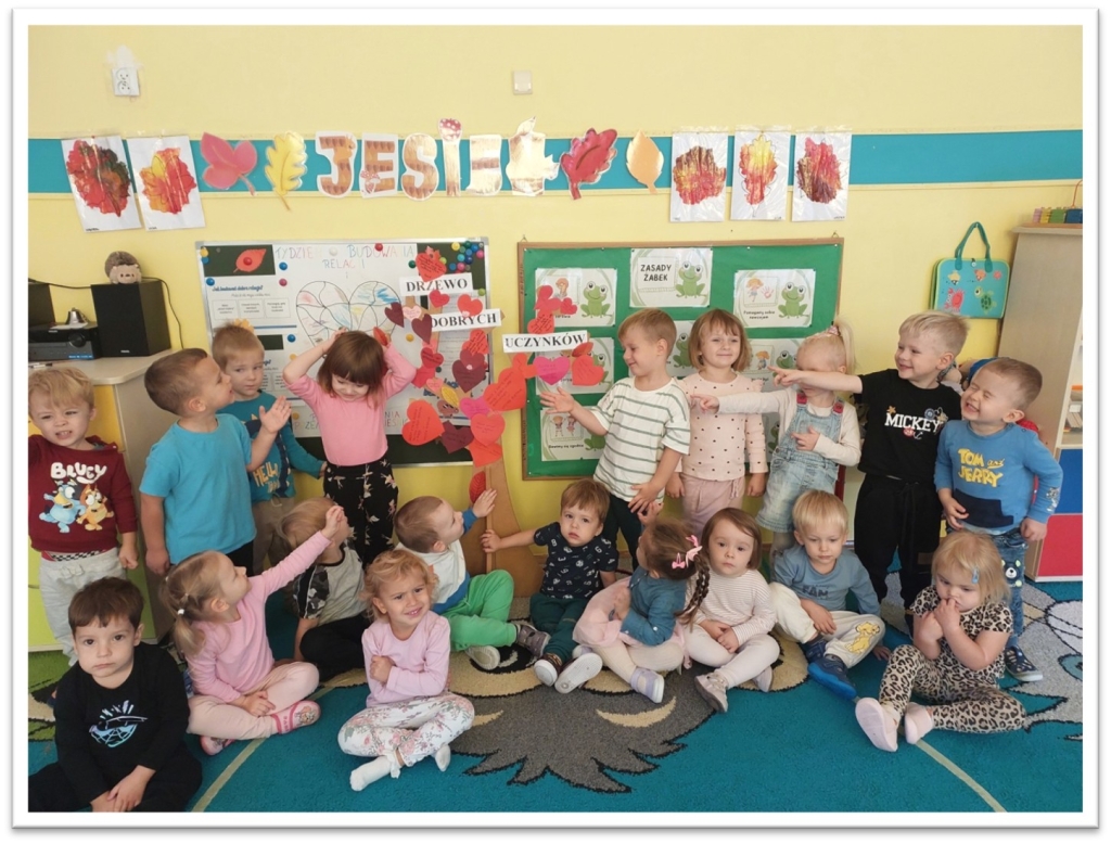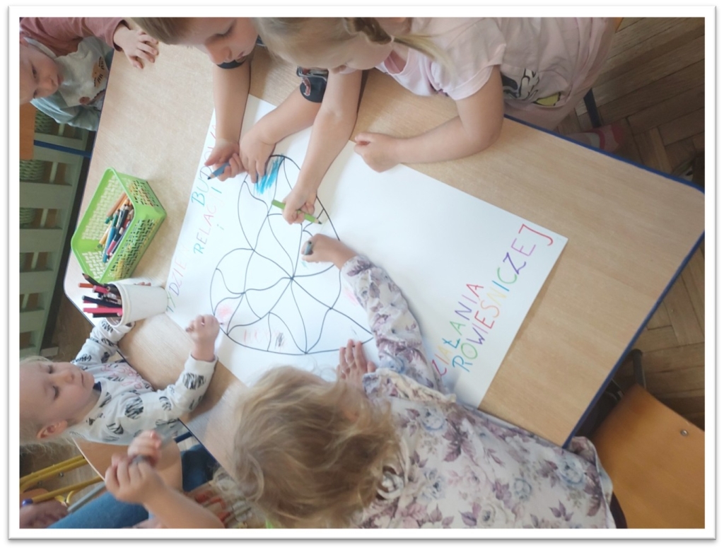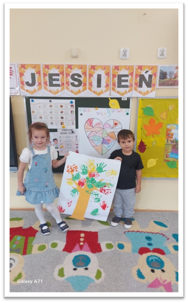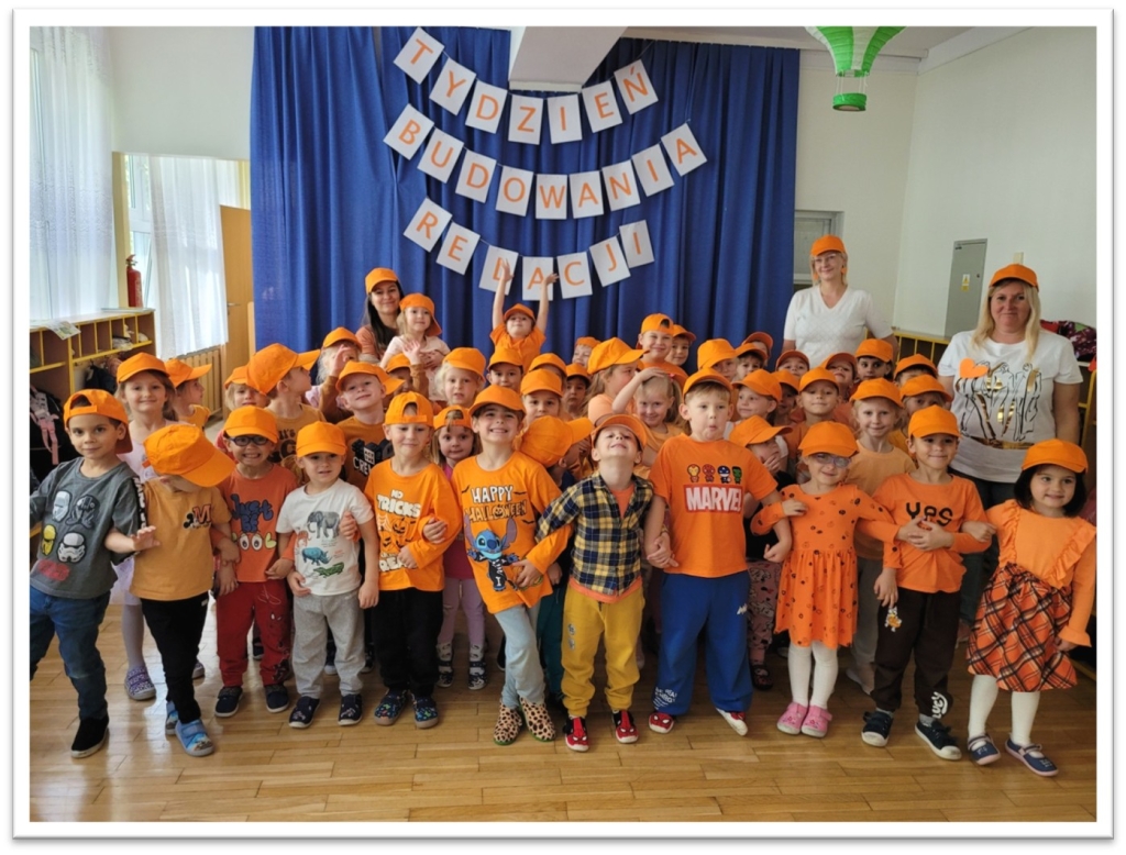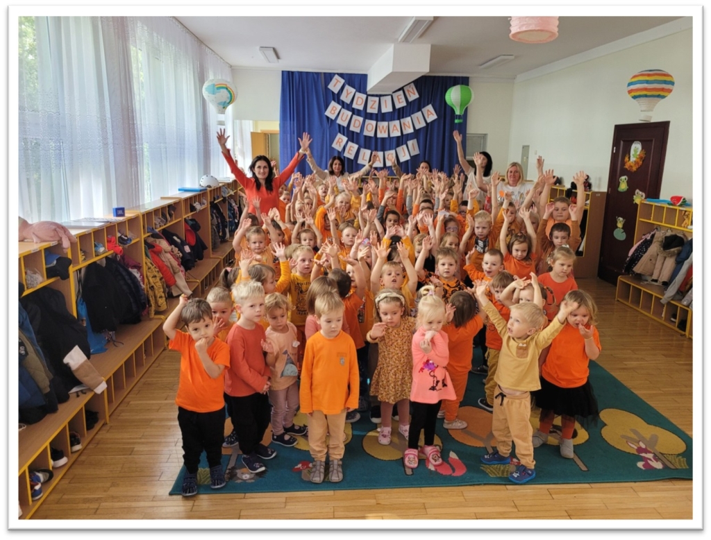 Zaprosiliśmy rodziców do uczestnictwa w Tygodniu Budowania Relacji. Pomoc w stworzeniu wraz z dzieckiem plakatu „Dobre uczynki”; „Drzewka Dobrych Uczynków”. Poprzez kontakt mailowy- wysyłanie rodzicom informacji dotyczącej pomocy dzieciom w budowaniu relacji i rozwijaniu odporności emocjonalnej. 2 października w ramach ogólnopolskiej akcji „Tygodnia Budowania Relacji” w naszym przedszkolu na znak solidarności i wzajemnego wsparcia pozytywnych postaw wszystkie przedszkolaki przyszły ubrane na pomarańczowo.